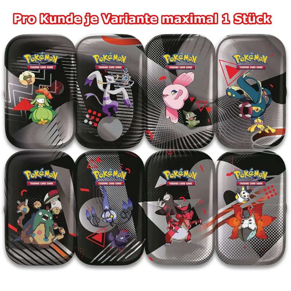 Die acht unterschiedlichen Mini-Tin-Boxen bieten Illustrationen, die zu einem großen Bild kombiniert werden können. Jede Mini-Tin-Box enthält zwei Boosterpacks der neuen Erweiterungen, einen Stickerbogen und eine Karte mit der Illustration der Mini-Tin-Box. Wähle deinen Favoriten oder schnapp sie dir alle!